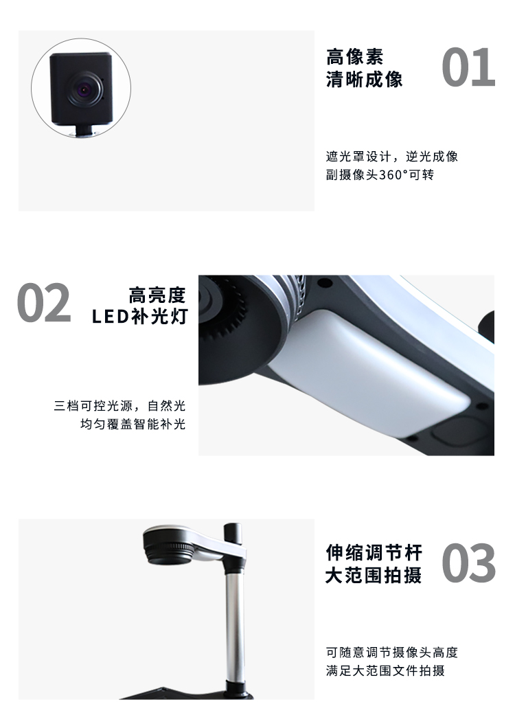 3、高亮度LED辅助灯,解决光线不足的情况下,文件不清晰的情况;